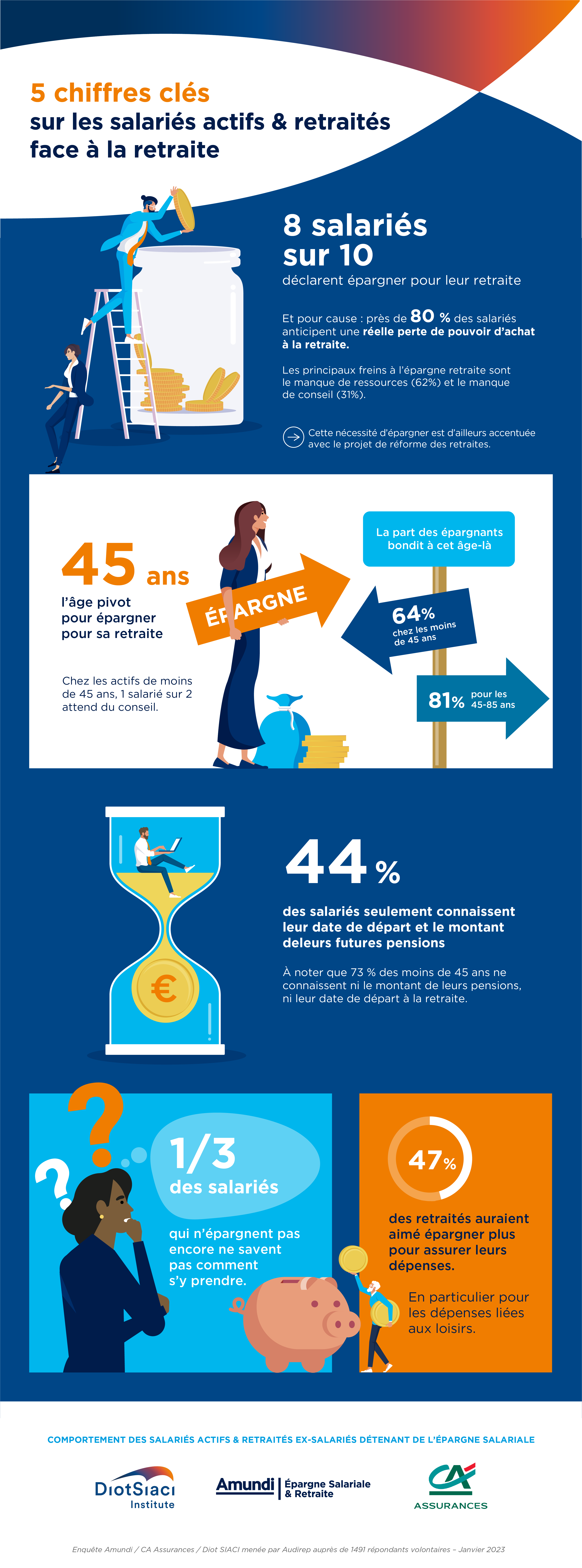 62% des répondants affirment connaitre leur date de départ à la retraite, mais moins de la moitié (46%) connaît le montant de ses futures pensions et un tiers (73% chez les moins de 45 ans) ne connait ni sa date de départ ni le montant de ses pensions.