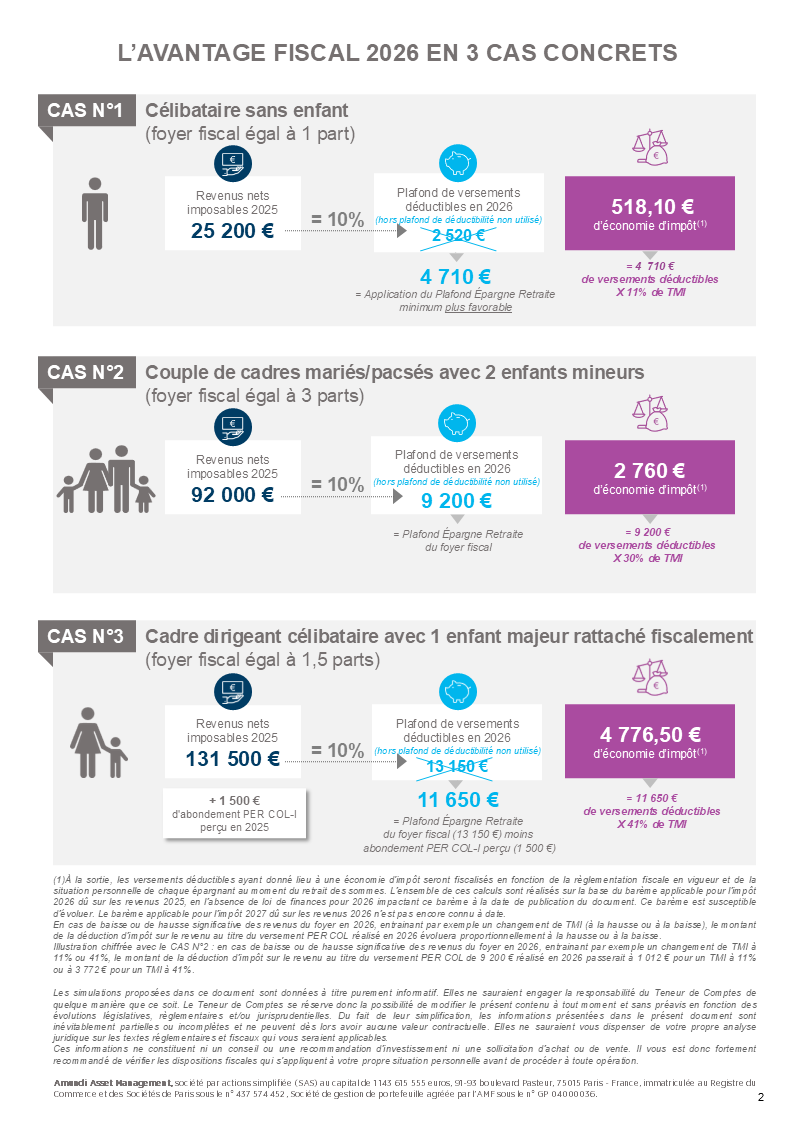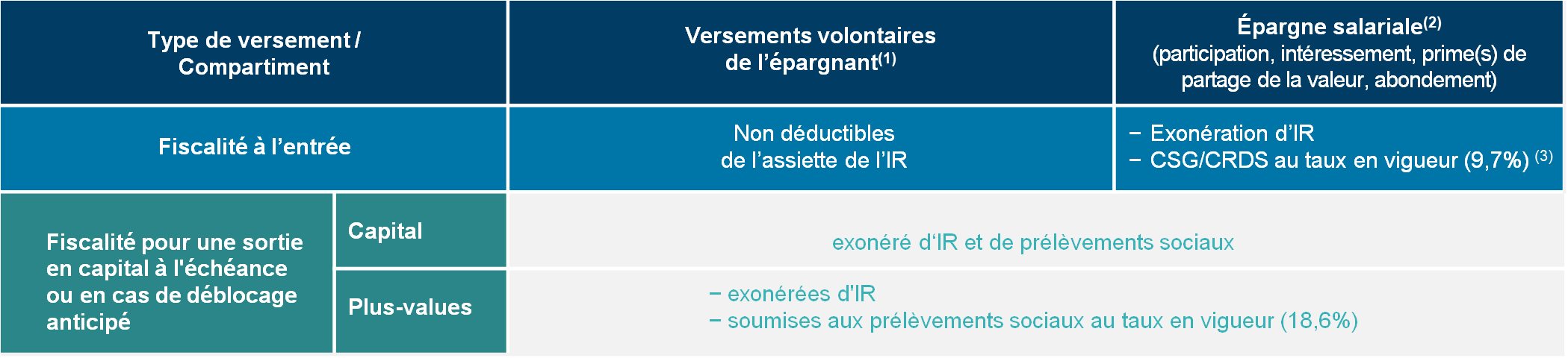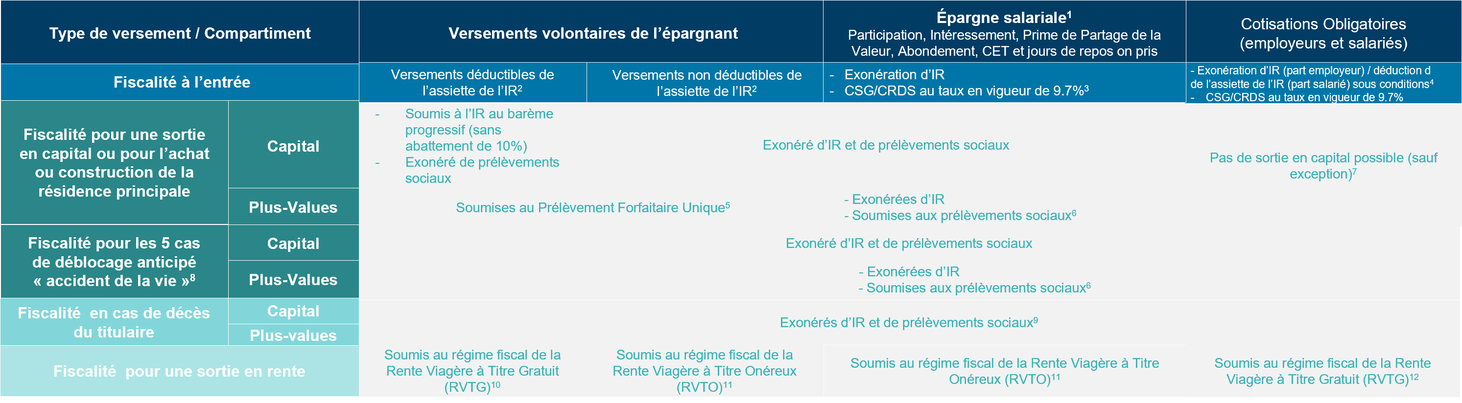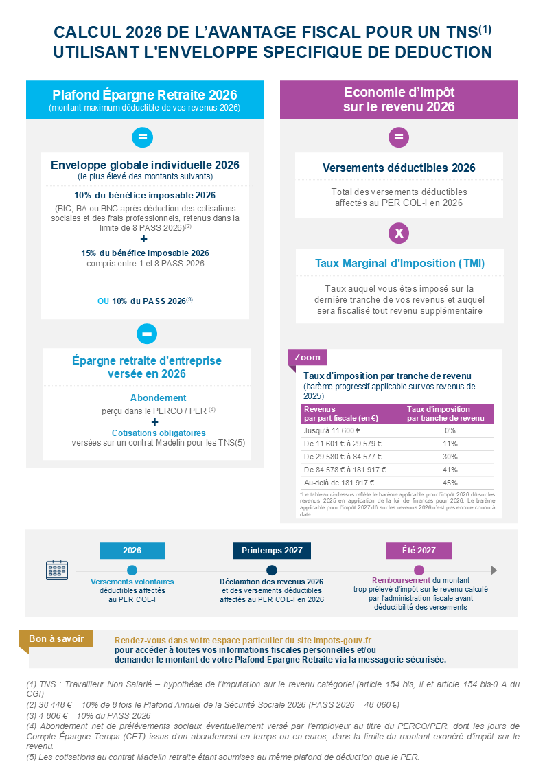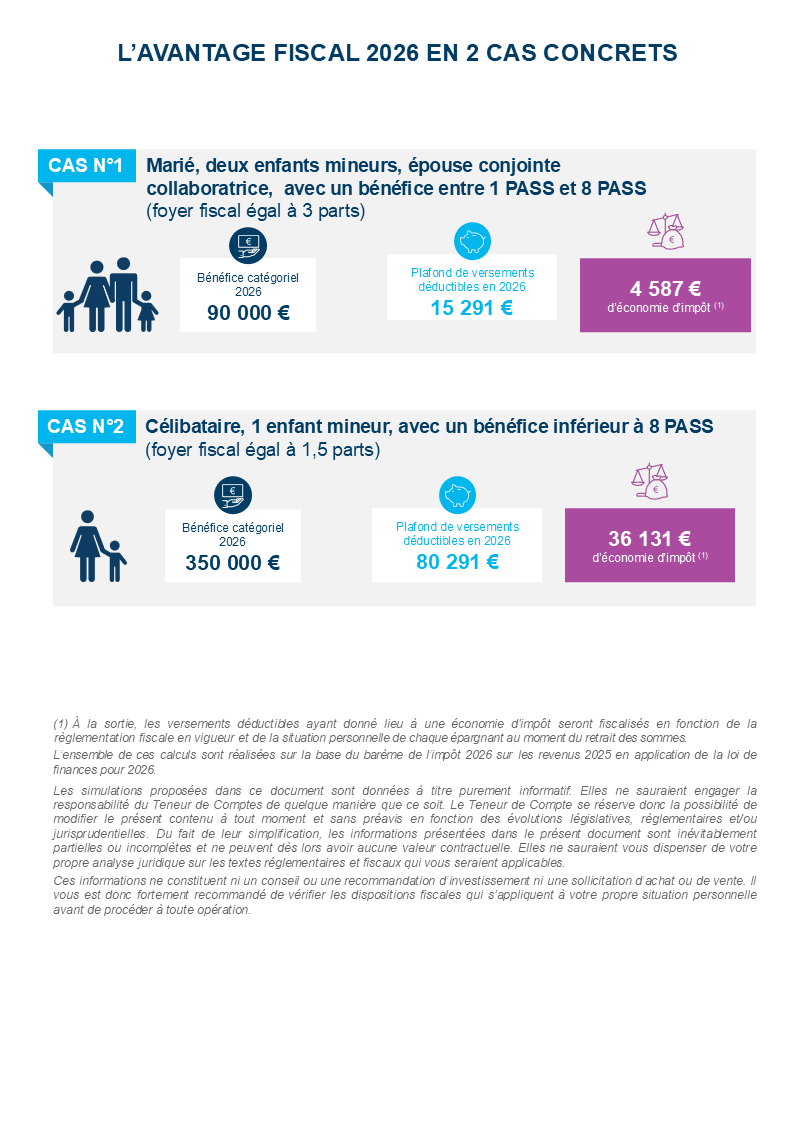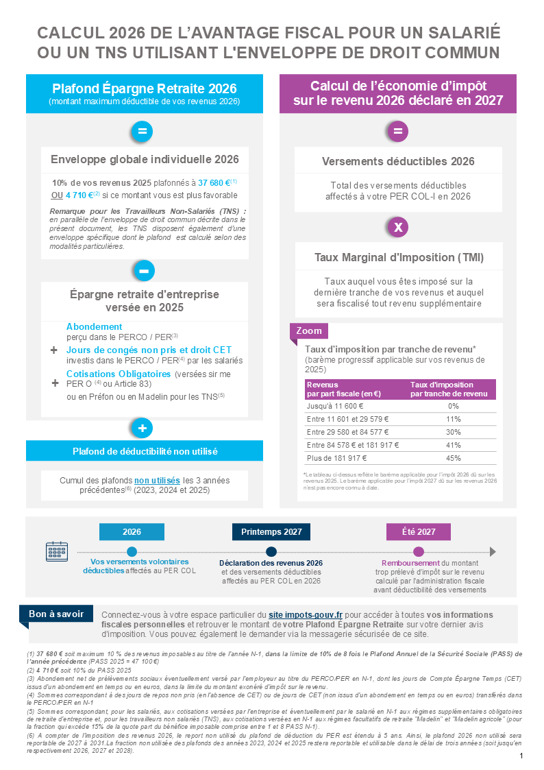 2- Chaque épargnant peut choisir de déduire de l'assiette de ses revenus imposables à l'Impôt sur le Revenu (IR) tout ou partie de ses versements volontaires effectués dans un PER, (i) dans le respect d’un Plafond individuel et annuel d’Épargne Retraite (sauf options spécifiques), (ii) à la condition d’être âgé de 18 à 70 ans. La déductibilité maximale en année N s’élève à 10% des revenus professionnels nets de frais de l’année N-1, retenus dans la limite de 8 fois le Plafond Annuel de la Sécurité Sociale (PASS) de l’année précédente, ou de 10 % du PASS N-1 si ce montant est plus élevé, et d’une enveloppe spécifique pour les Travailleurs Non-Salariés. Ce plafond est calculé selon les conditions définies sur le site https://www.impots.gouv.fr/portail/particulier/epargne-retraite . À l'entrée, le traitement d'un versement volontaire déductible donnera lieu à des frais précisés dans le Guide Tarifaire en vigueur. A la sortie, ces sommes seront fiscalisées en fonction de la règlementation fiscale en vigueur et de la situation personnelle de chaque épargnant au moment du retrait des sommes. Concernant les versements volontaires non déductibles, le titulaire est libre de choisir le montant qu'il souhaite verser, sans restriction de montant.