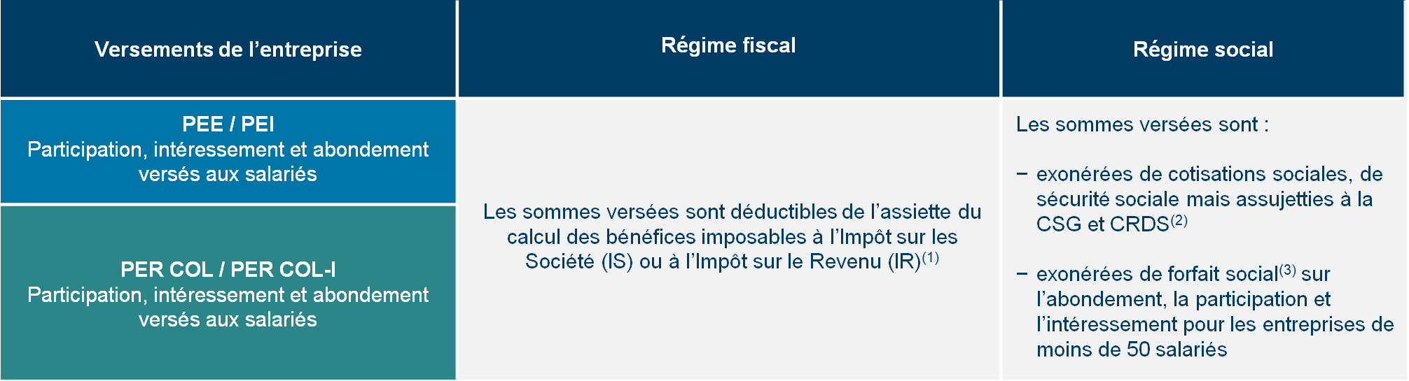(3) Les entreprises de moins de 50 salariés sont exonérées du forfait social sur les sommes versées au titre de la participation, de l'intéressement et de la prime de partage de la valeur, ainsi que sur l’abondement sur un plan d'épargne salariale (PEI et PER COL-I), quel que soit le support sur lequel ces sommes sont investies (CSS art. L 137-15 modifié). - Les entreprises dont l'effectif est compris entre 50 salariés et moins de 250 salariés sont également exonérées de cette contribution, mais uniquement sur les sommes versées au titre de l'intéressement et de la prime de partage de la valeur (CSS art. L 137-15 modifié)